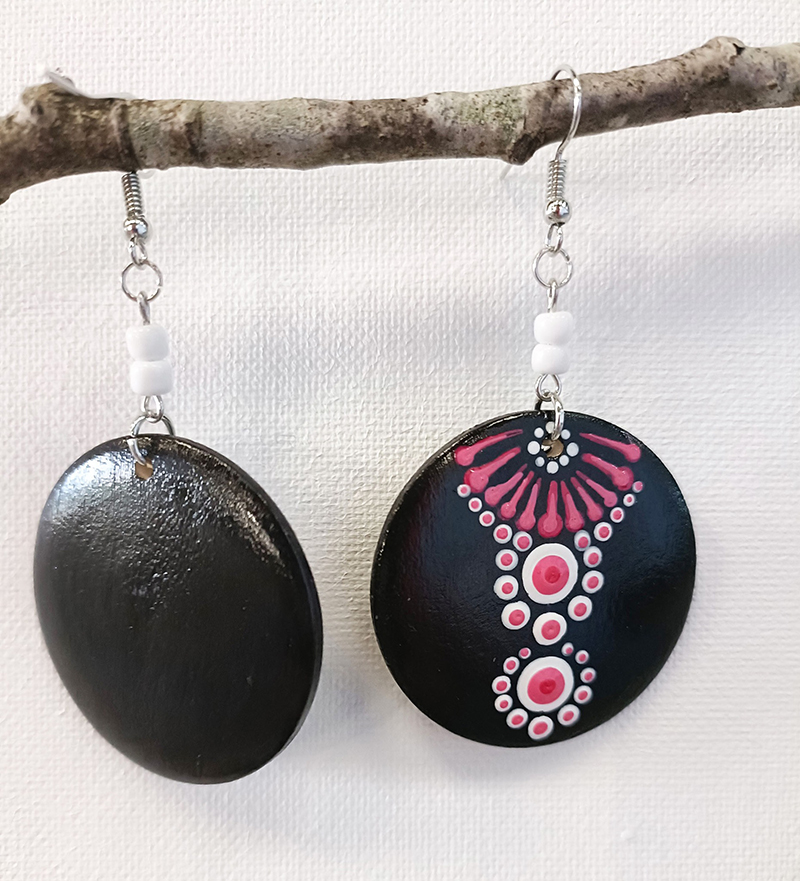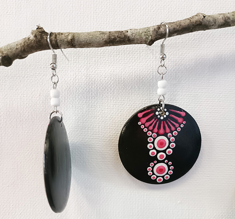 Perles, support bois de 4 cm de diamètre, peinture acrylique et vernis, accroches argentées et embout plastique, pochette cadeau en Organza.