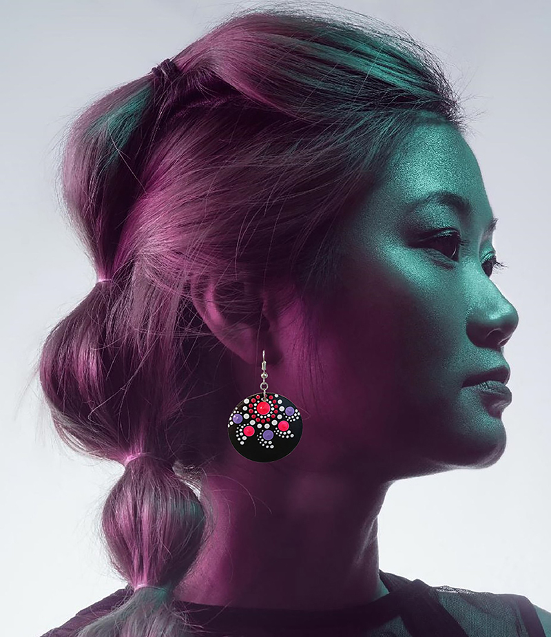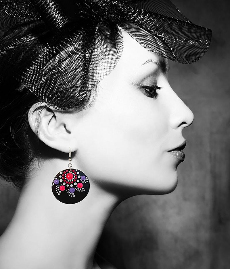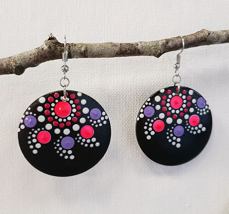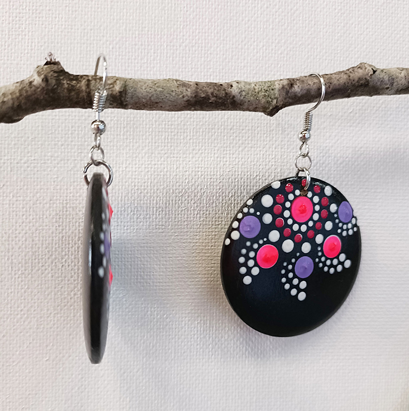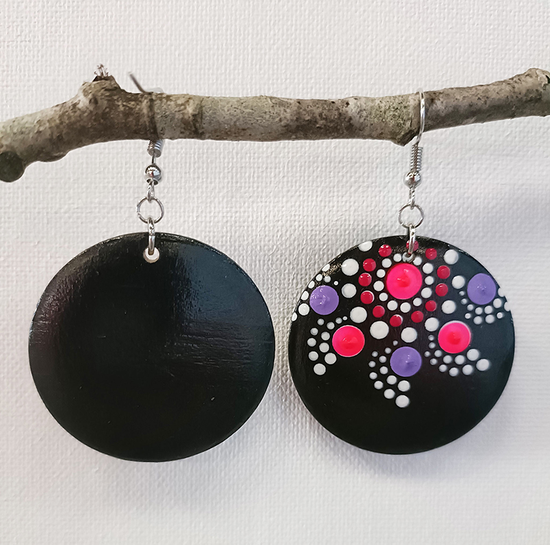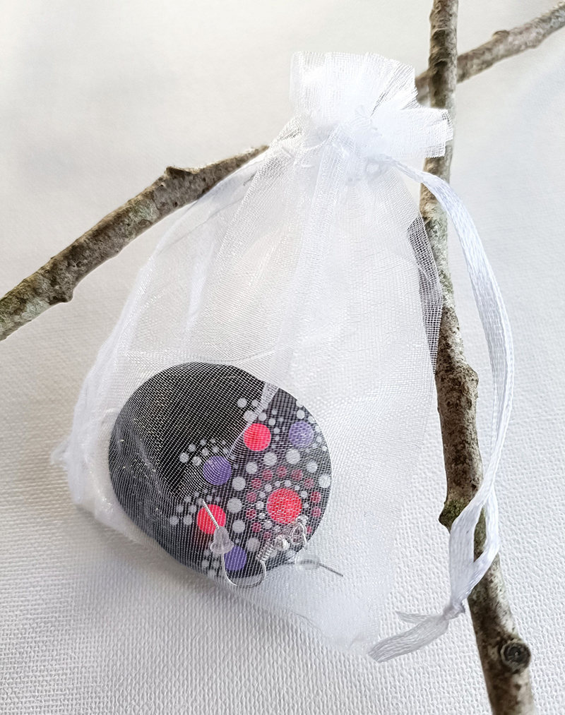 Support bois de 4 cm de diamètre, peinture acrylique et vernis, accroches argentées et embout plastique, pochette cadeau en Organza.