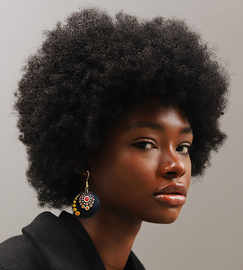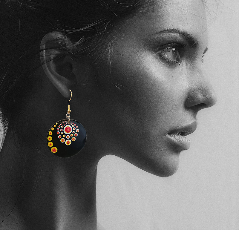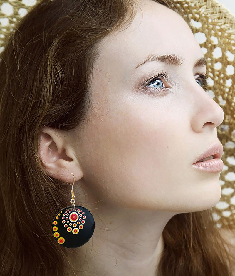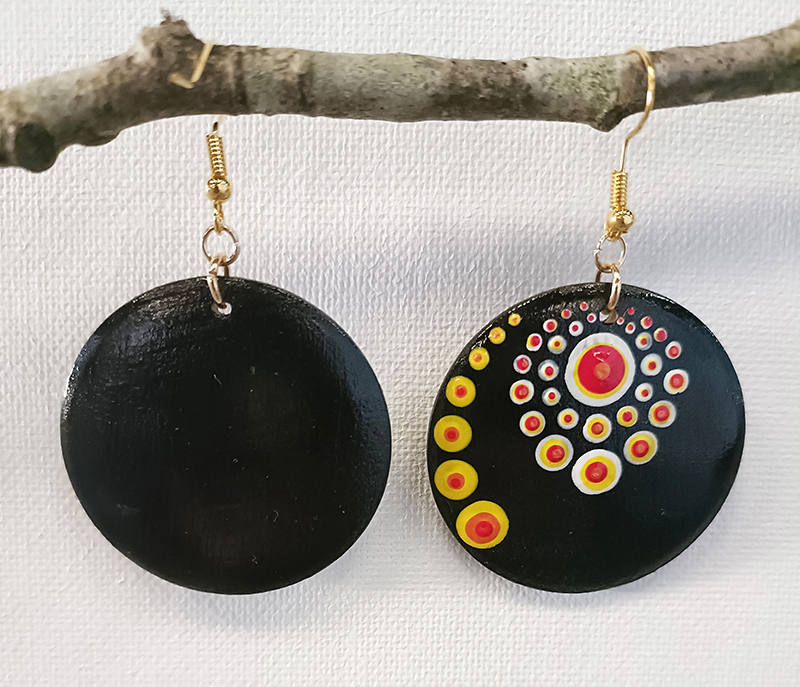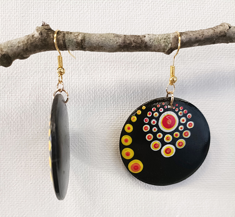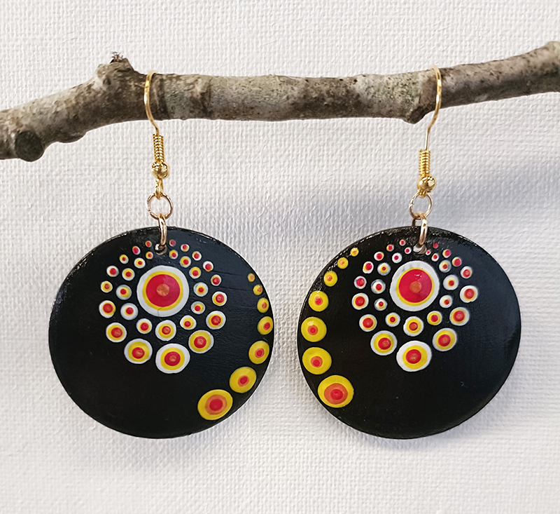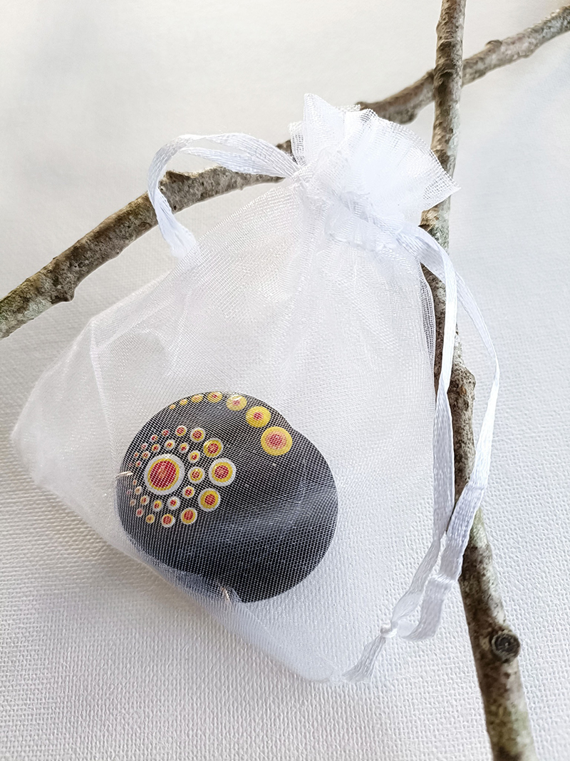 Support bois de 4 cm de diamètre, peinture acrylique et vernis, accroches dorées et embout plastique, pochette cadeau Organza.