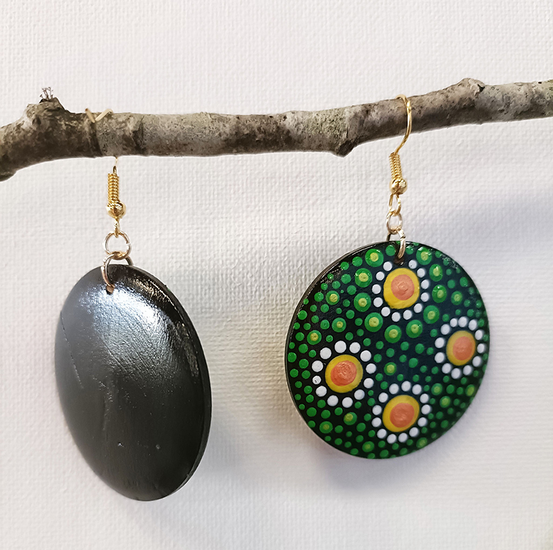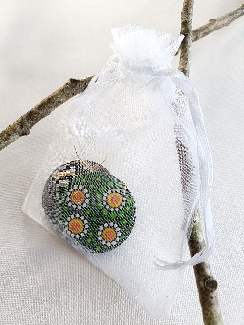 Support bois de 4 cm de diamètre, peinture acrylique et vernis, accroches dorées et embout plastique, pochette cadeau en Organza.
