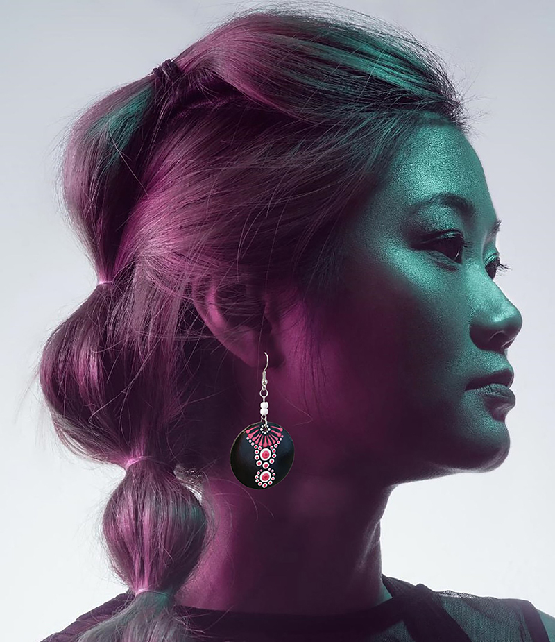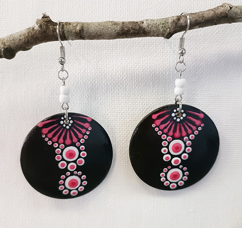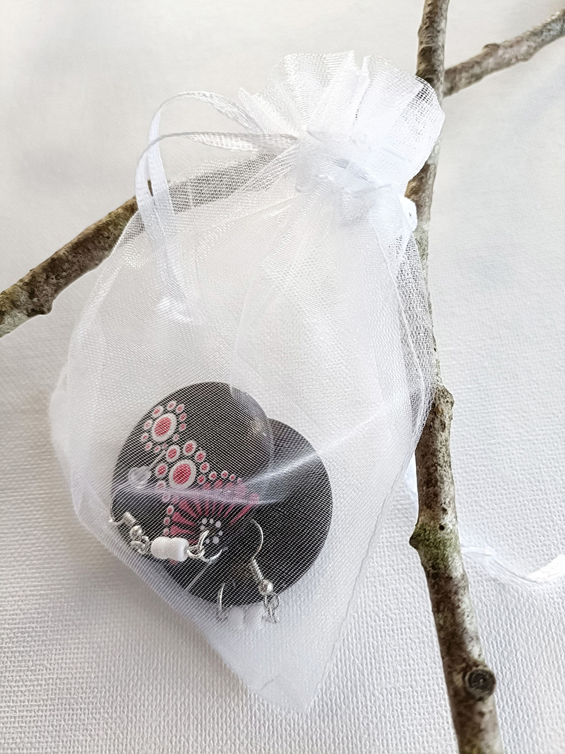 Perles, support bois de 4 cm de diamètre, peinture acrylique et vernis, accroches argentées et embout plastique, pochette cadeau en Organza.